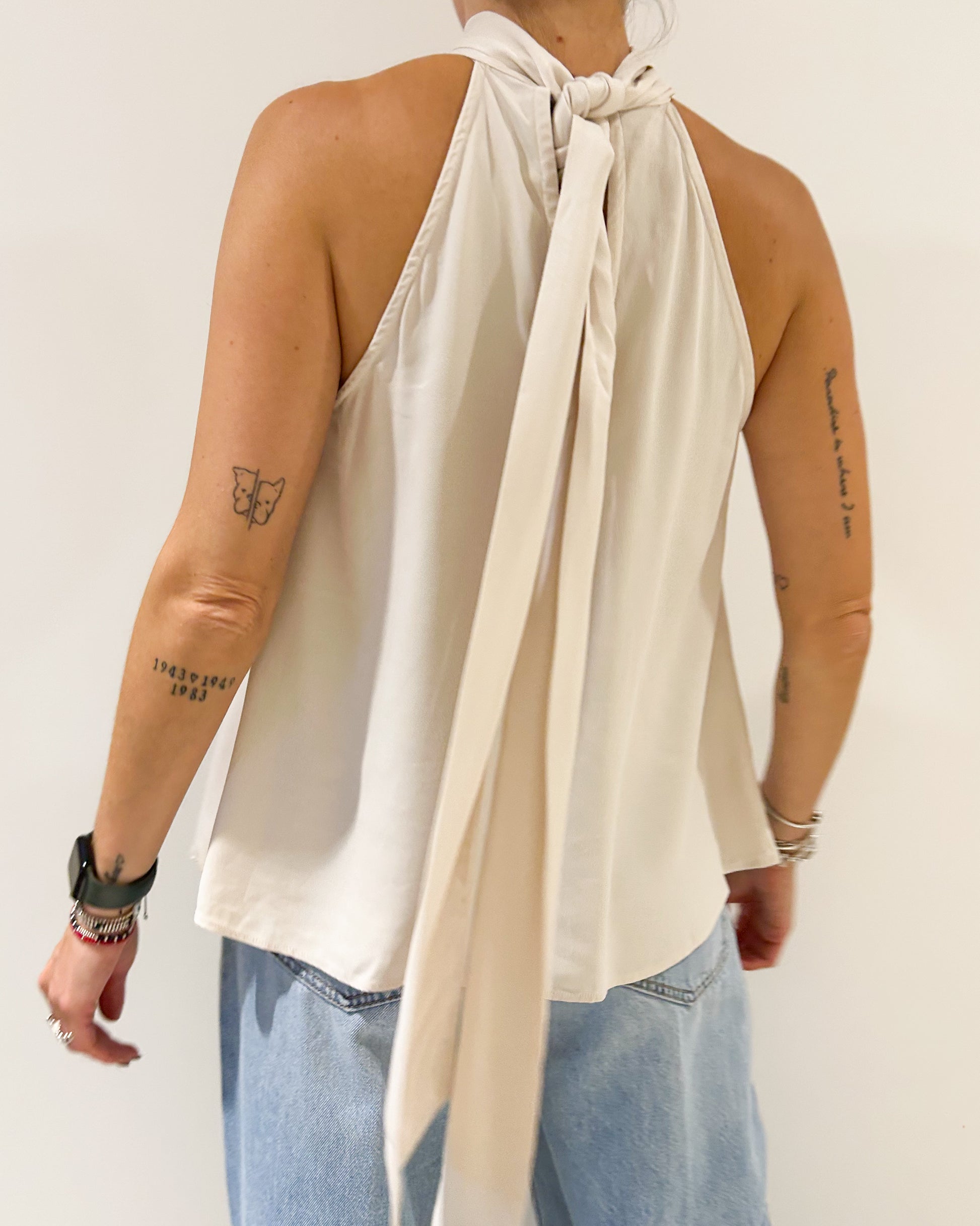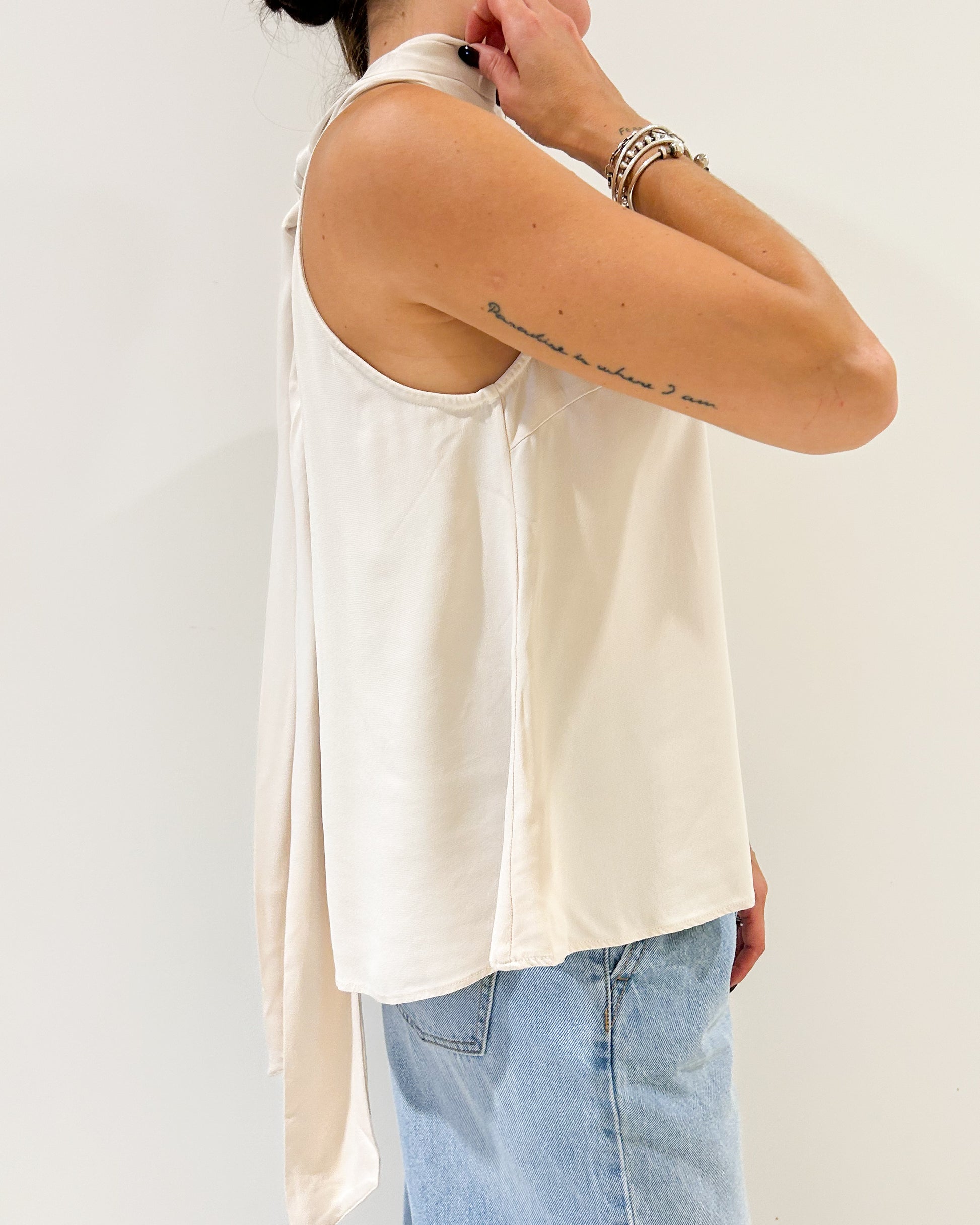 Top Jazmín Chebar. Confeccionado en tela tipo seda. Modelo halter, con detalle de lazo en la espalda.