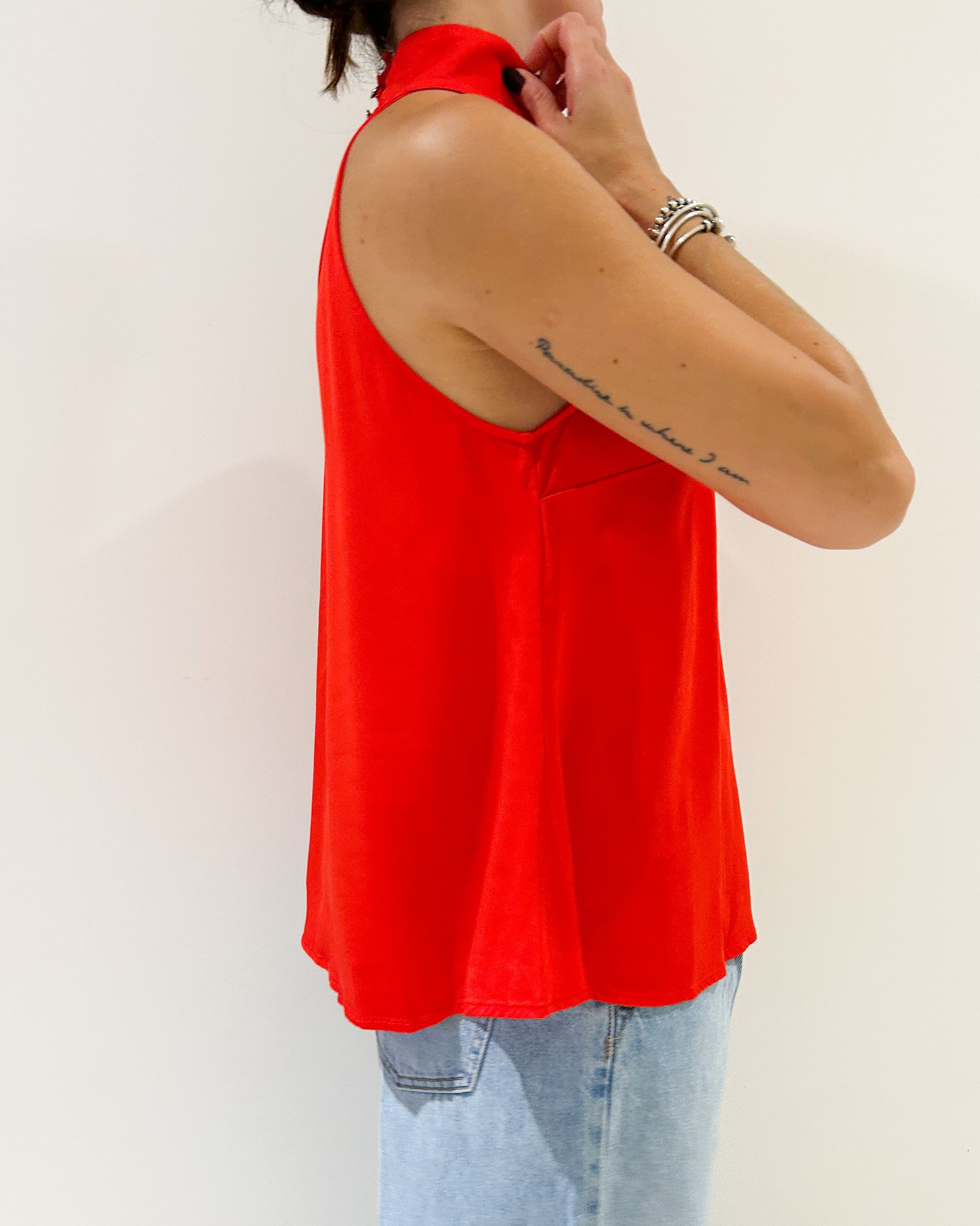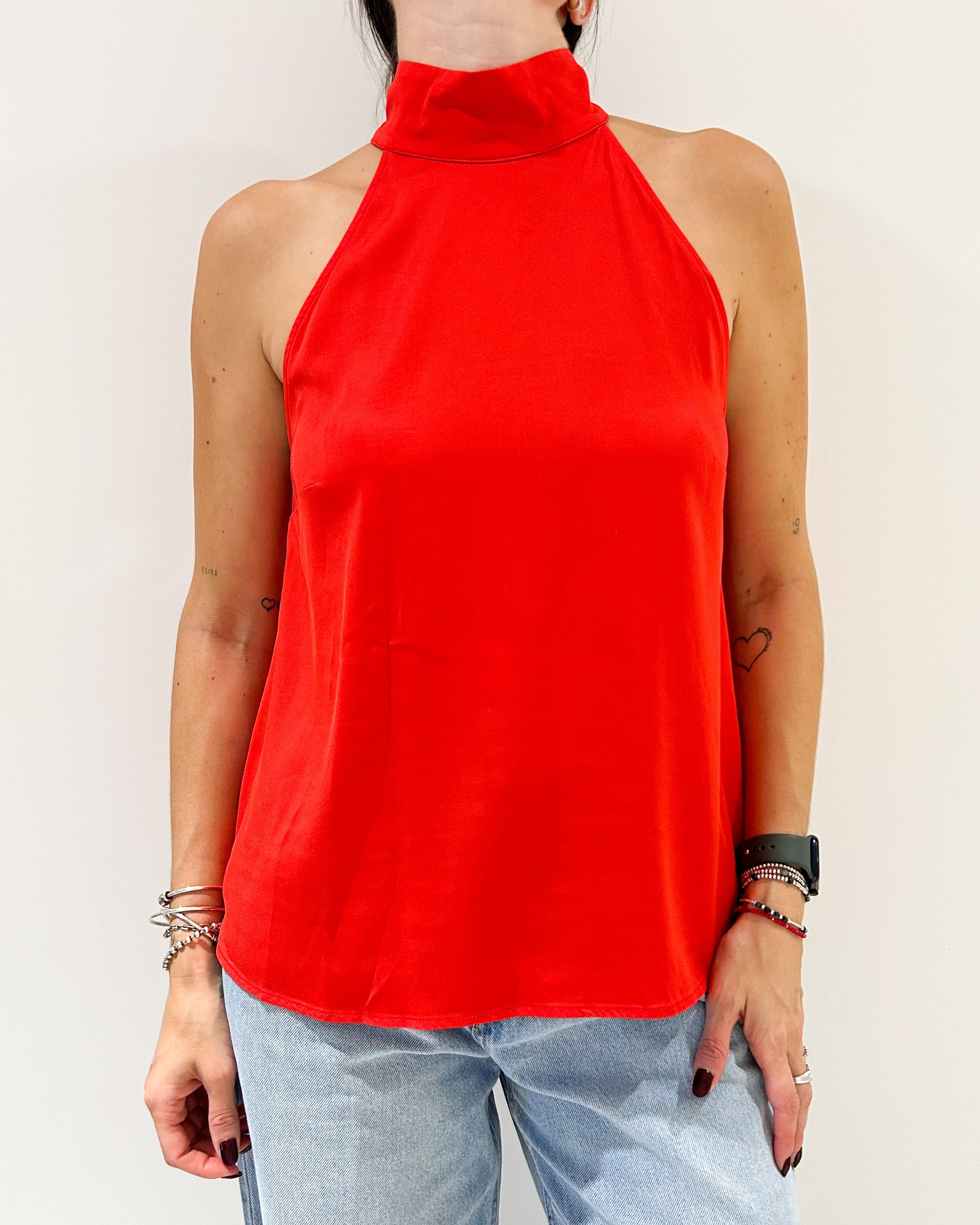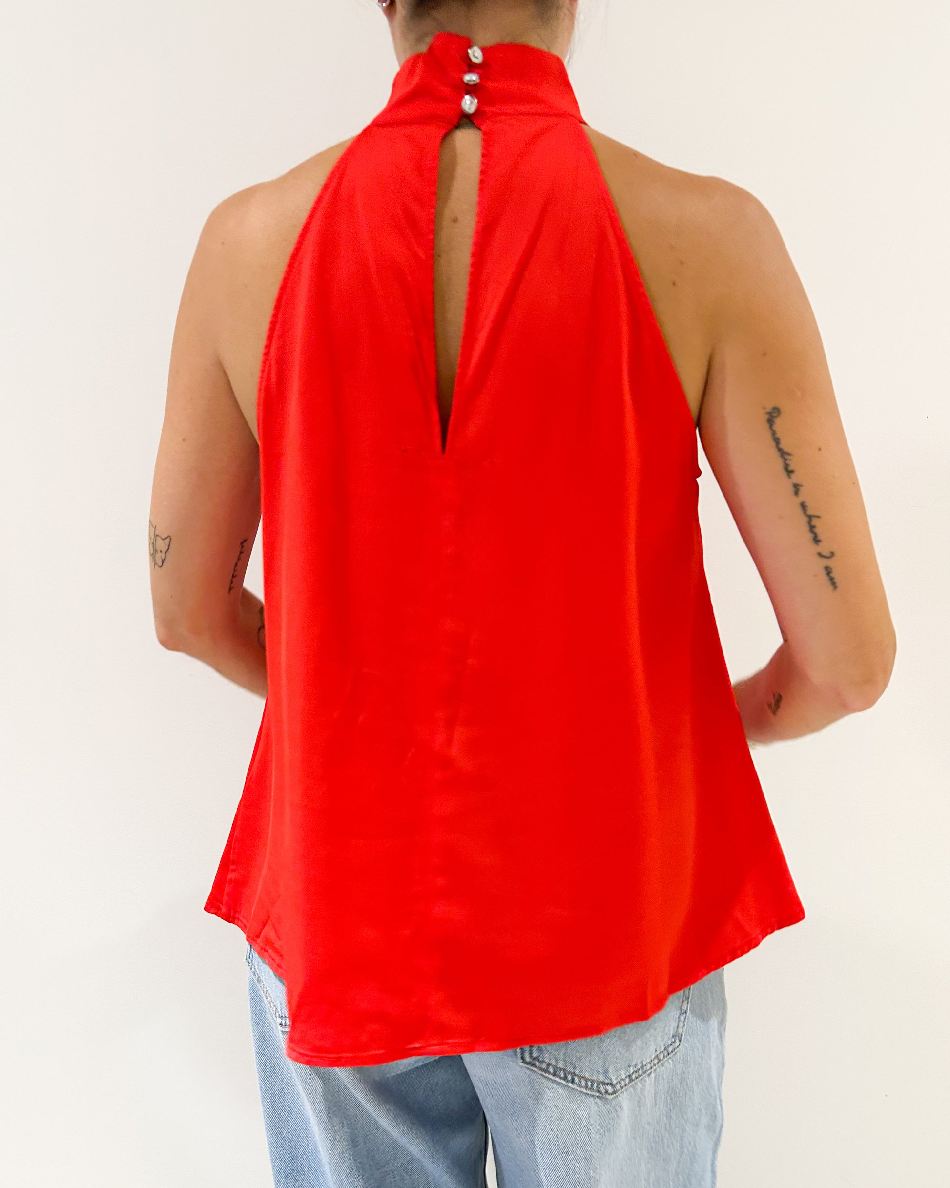 Top Jazmín Chebar. Confeccionado en tela tipo seda. Modelo halter, con detalle de botones en la espalda.
